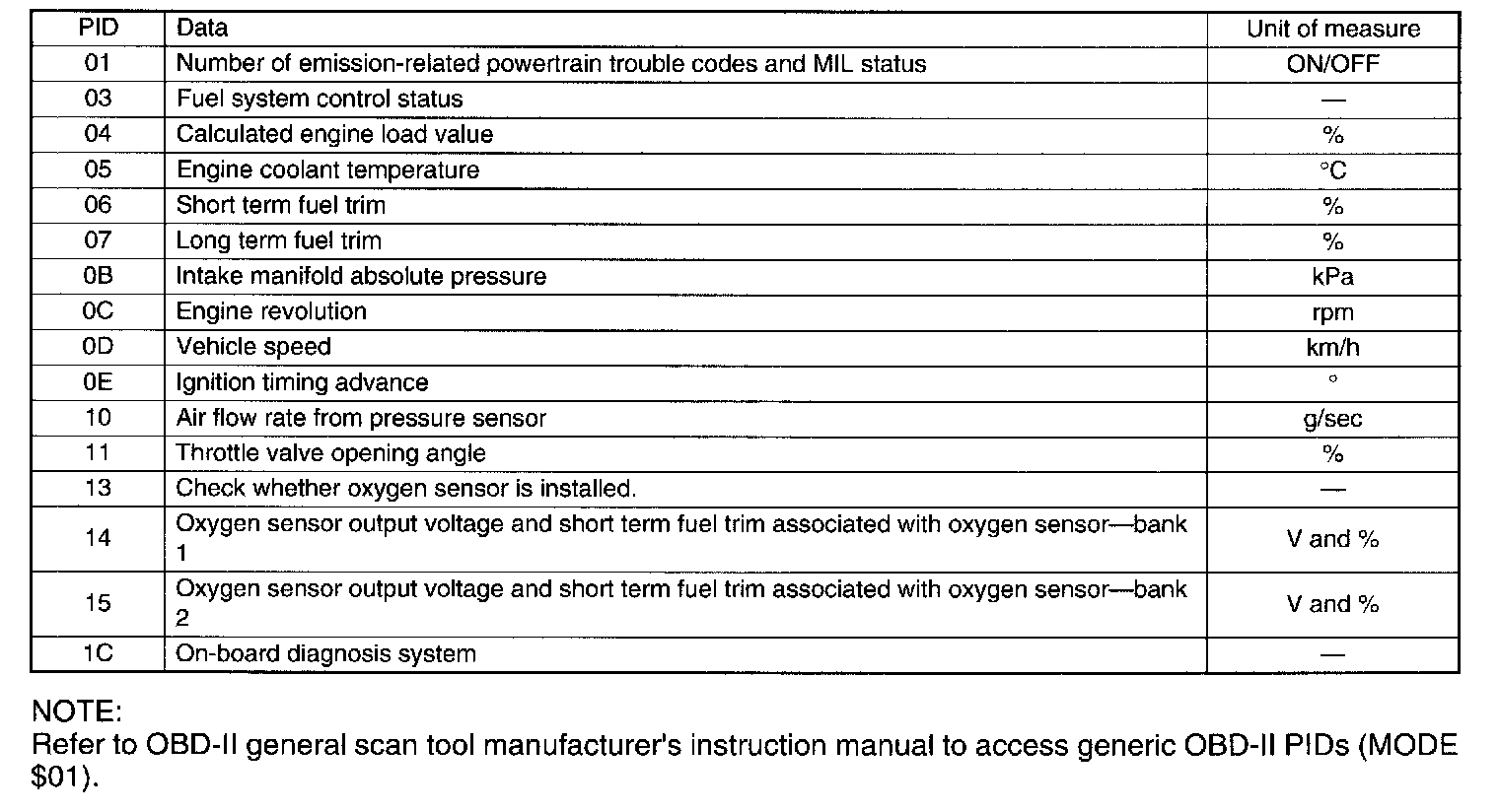 A list of the support data and PID (Parameter Identification) codes are shown in the table.