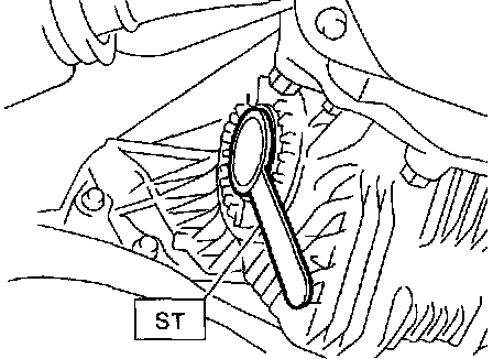 17. Insert the front drive shaft by aligning spline part of front drive shaft and spline part of differential bevel gear, and then remove the ST.