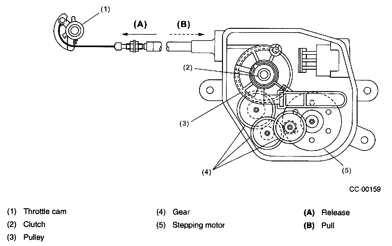 In response to a signal from the cruise control module, the clutch in the actuator is turned ON. This causes the stepping motor to operate, pulling the throttle cam for speed control.