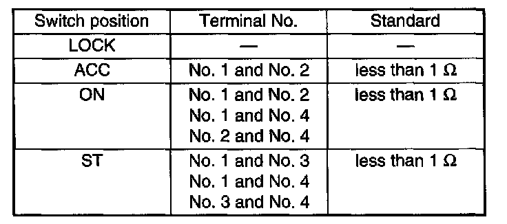 4. Turn the ignition key plate to each position and measure the ignition switch resistance.