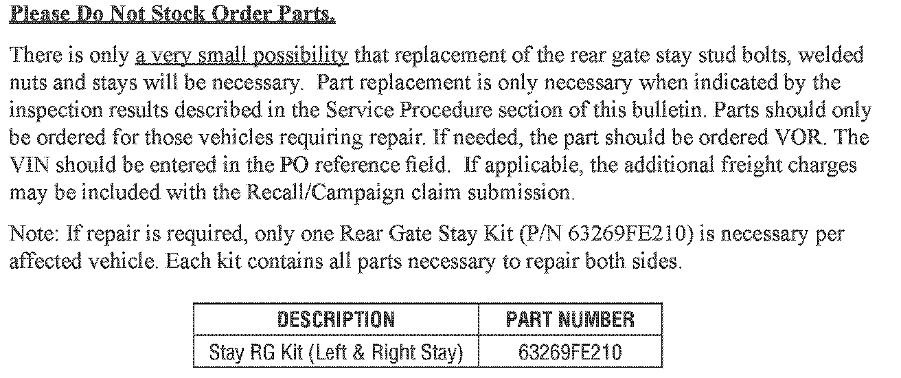 This recall will involve the inspection of rear gate stay stud bolts for proper tightening torque. Based on the product investigation, the number of affected vehicles produced with insufficiently tightened rear gate stay stud bolts is expected to be very low. In some instances, replacement of one or both welded nuts along with both rear gate stays and stud bolts may be necessary. Please refer to the Service Procedure section of this bulletin for more details.