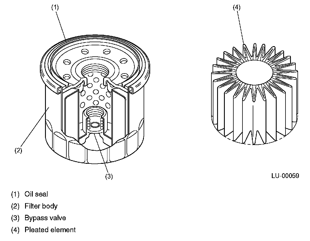 The oil filter is a full-flow filtering, cartridge type that utilizes a paper element.It also has a built-in bypass valve.The filter element has a special pleat design to increase the effective filtering area.