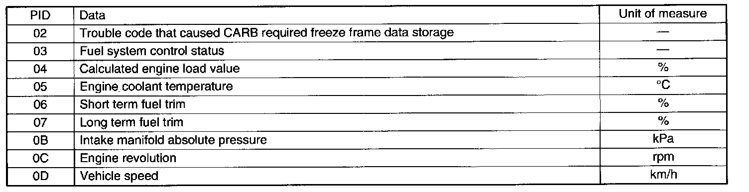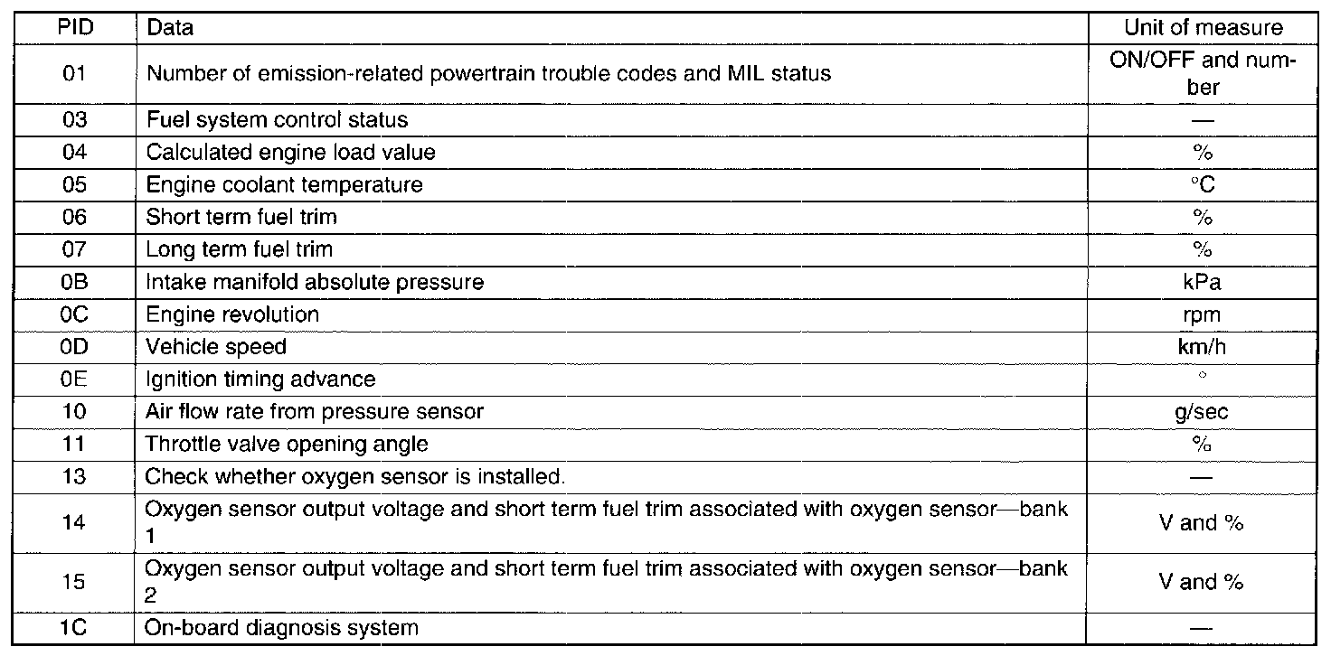 A list of the support data and PID (Parameter Identification) codes are shown in the table.