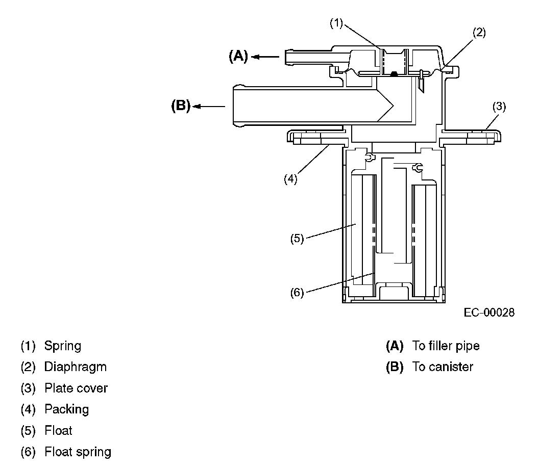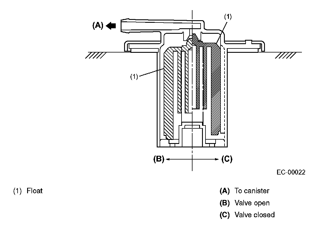 The fuel cut valve is built onto the evaporation pipe of the fuel tank. The rising level of the fuel in the fuel tank causes the float to move up and close the cap hole so that no fuel can enter the evaporation line.