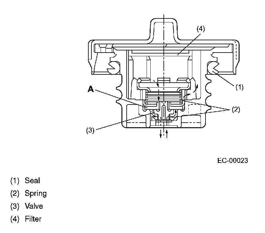 When there is no problem with the fuel vapor line, the filler pipe is sealed at the portion (A) and by the seal pressed against the filler pipe end. If vacuum develops in the fuel tank, the atmospheric pressure forces the spring down to open the valve; consequently outside air flows into the fuel tank, thus controlling the inside pressure.