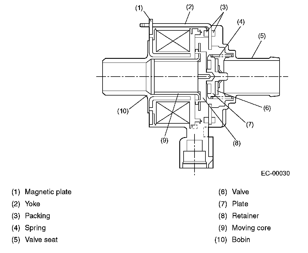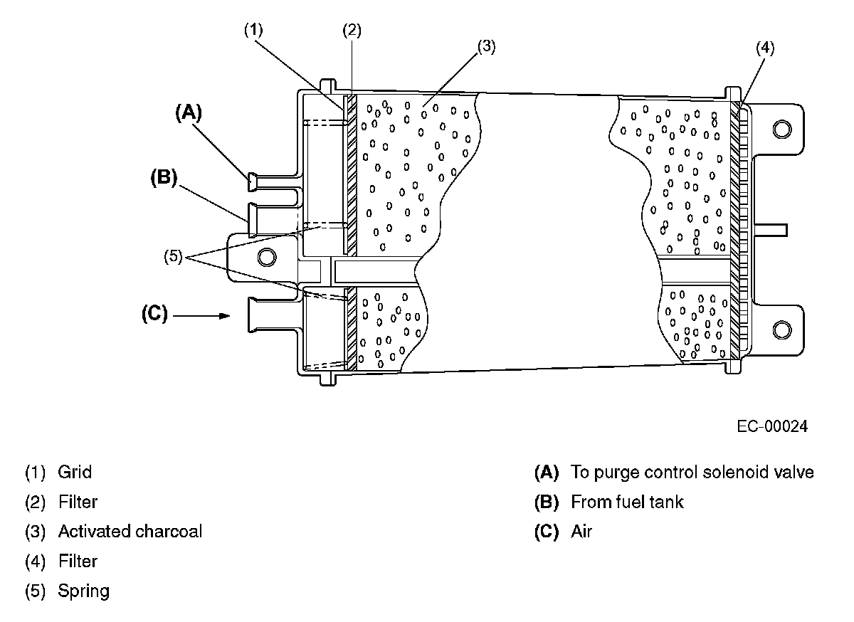 The charcoal filled in the canister temporarily stores fuel vapors. When the purge control solenoid valve is opened by a signal from the ECM, the external fresh air entering the canister carries the fuel vapors into the collector chamber.