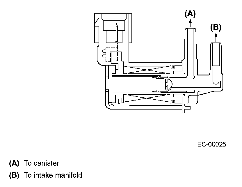 The purge control solenoid valve is on the evaporation line between the canister and intake manifold. The valve is installed at the underside of intake manifold.