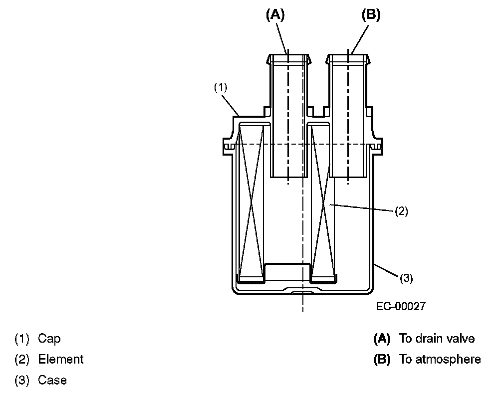 The drain filter is installed at the air inlet port of the vent control solenoid valve. It cleans the air taken in the canister through the vent control solenoid valve.