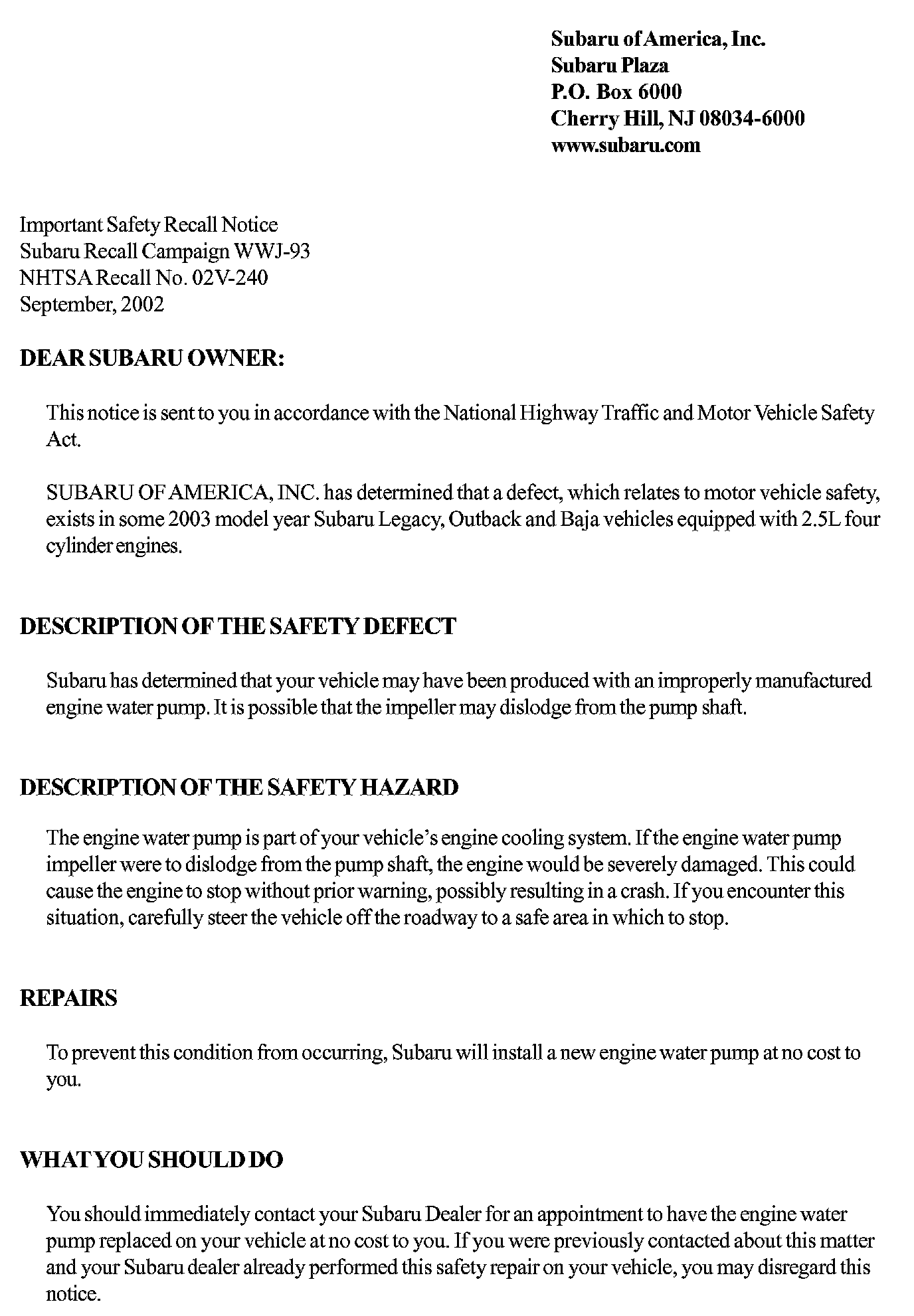 Subaru of America, Inc. (SOA) has determined that affected vehicles may have been produced with an improperly manufactured engine water pump. The water pump pulley could dislodge from the pump and cause severe engine damage.