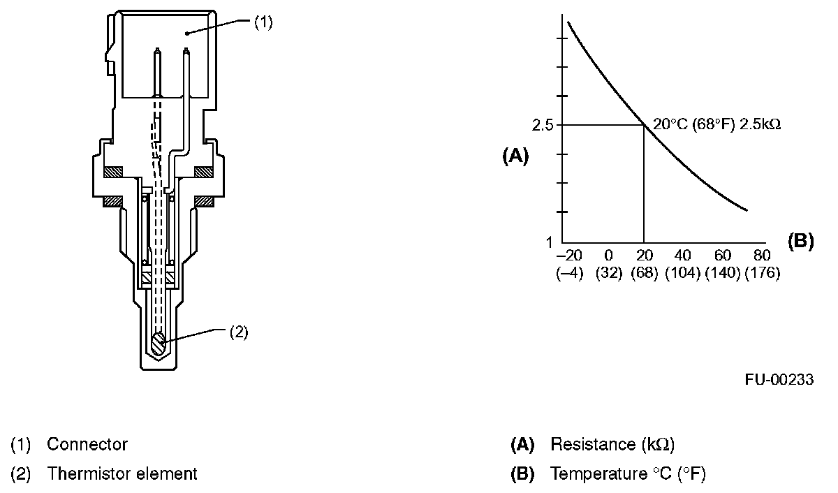 ENGINE COOLANT TEMPERATURE SENSORThe engine coolant temperature sensor is located on the engine coolant pipe. The sensor uses a thermistor whose resistance changes inversely with temperature. Resistance signals as engine coolant temperature information are transmitted to the ECM to make fuel injection, ignition timing, purge control solenoid valve and other controls.