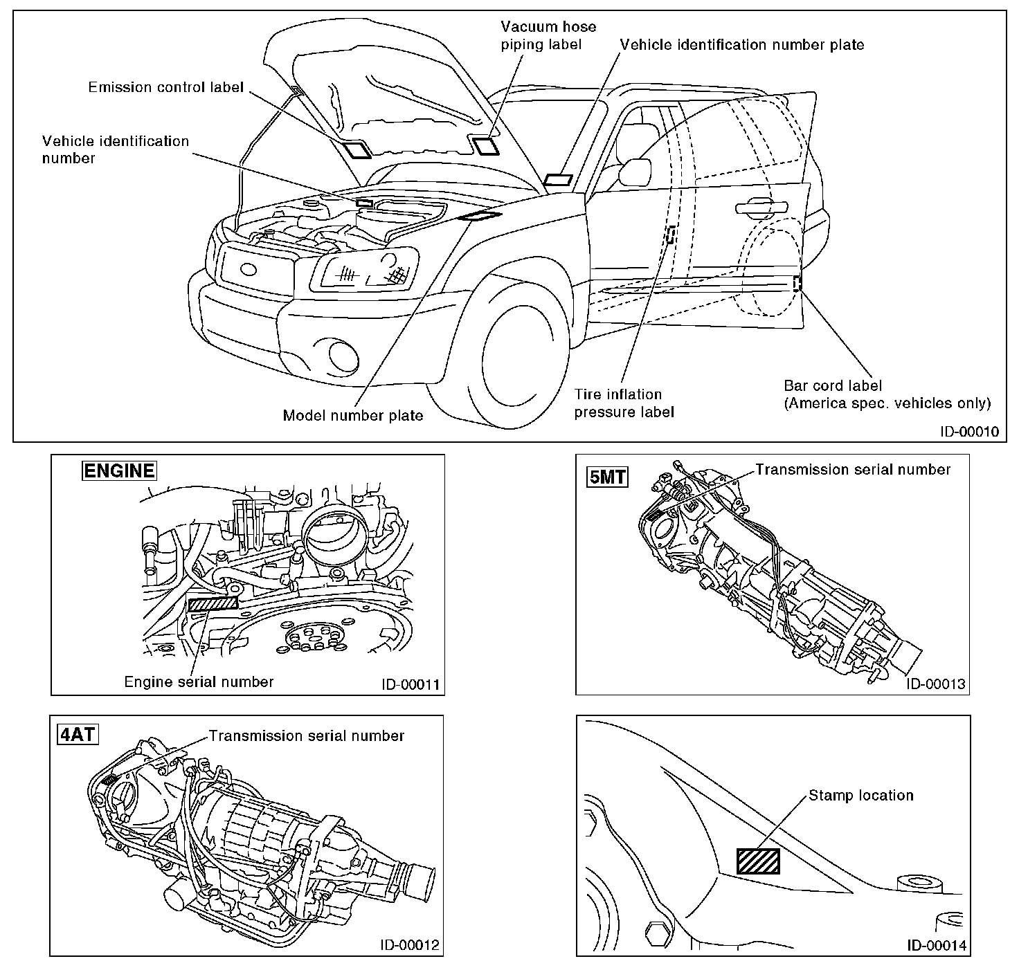 The model number plate indicates: the applied model, the option code, the trim code, the engine type, the transmission type, and the exterior color code. This information is helpful when placing orders for parts.