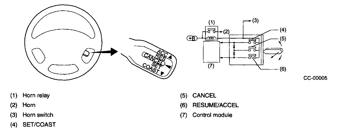 - When the vehicle is driven with the cruise control activated, the command switch controls its operation. It inputs SET/COAST signal, ACCEL/RESUME signal or CANCEL signal to the cruise control module.