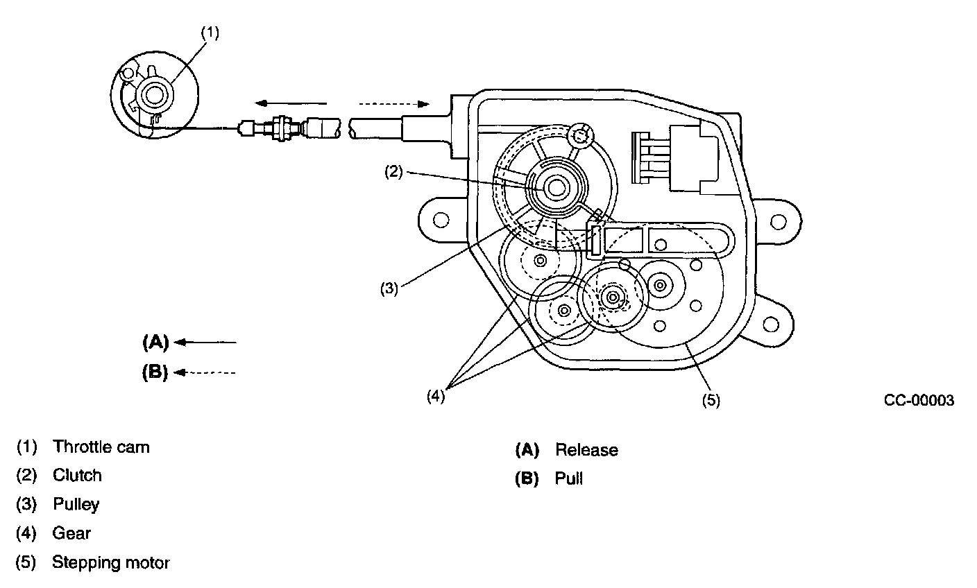 In response to a signal from the cruise control module, the clutch in the actuator is turned ON. This causes the stepping motor to operate, pulling the throttle cam for speed control.