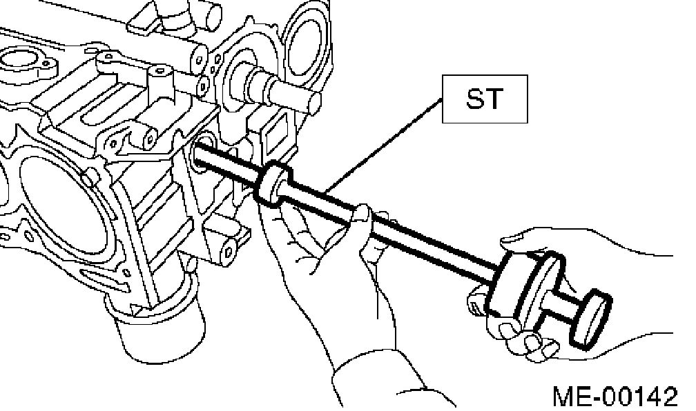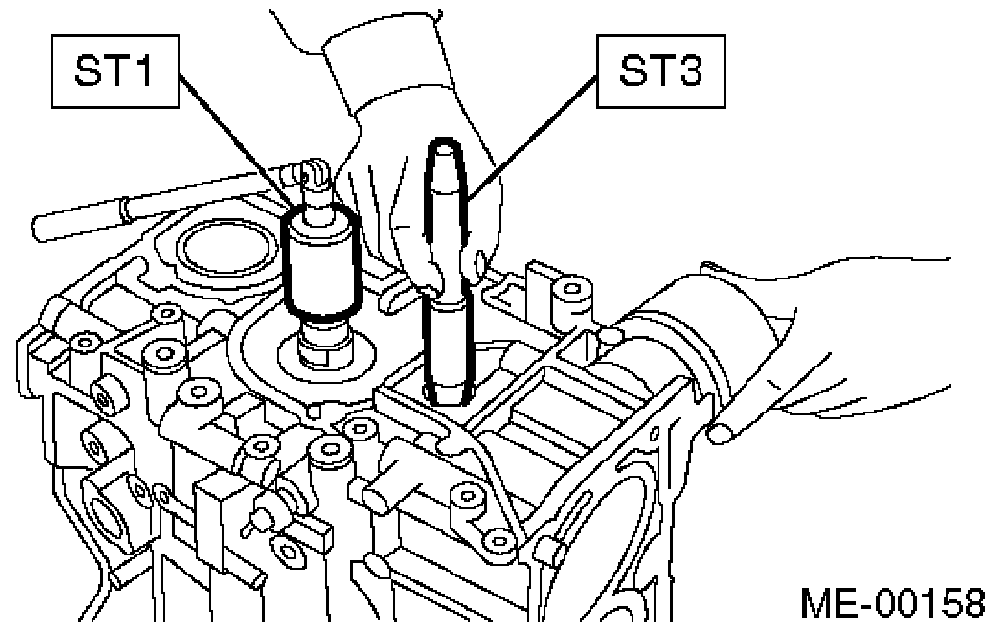 a. Apply a coat of engine oil to ST3, and then insert the ST3 into service hole to align piston pin hole with connecting rod small end.