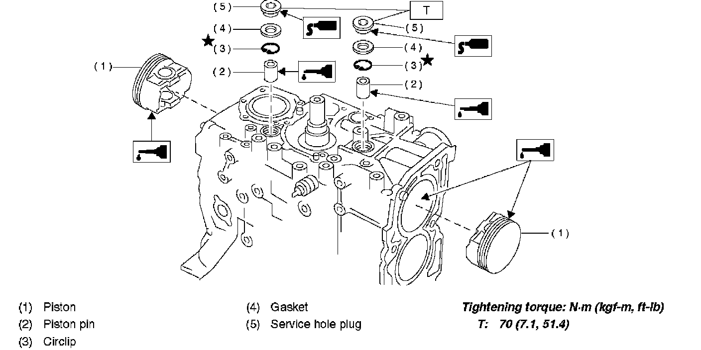b. Apply a coat of engine oil to the piston pin and insert piston pin into piston and connecting rod through service hole.
