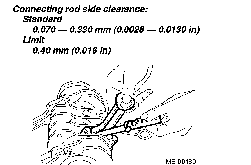 3. Install the connecting rod fitted with bearing to crankshaft, and then measure the side clearance (thrust clearance). Replace the connecting rod if the side clearance exceeds the specified limit.