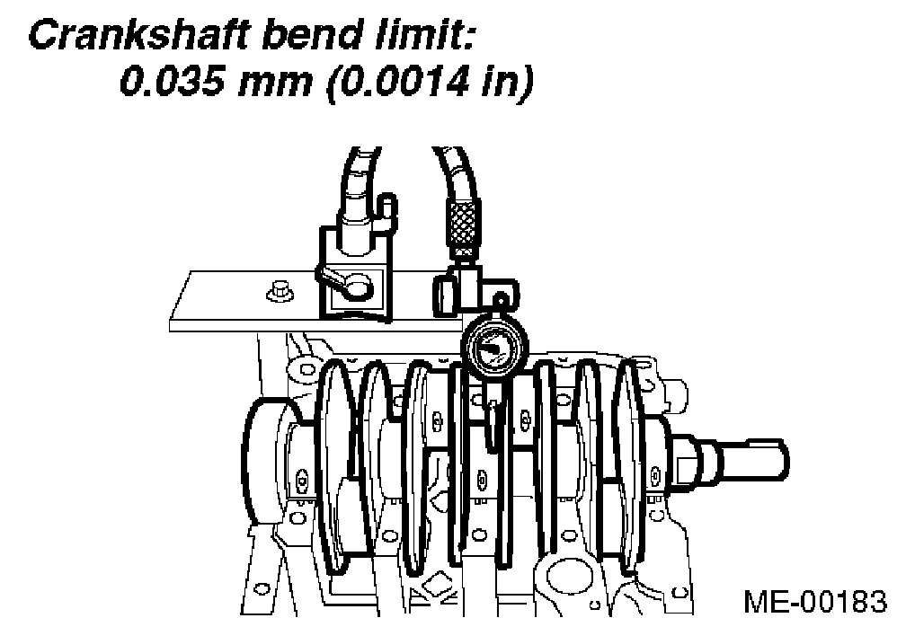 NOTE: If a suitable V-block is not available, install the #1 and #5 crankshaft bearing on cylinder block, position the crankshaft on these bearings and measure the crankshaft bend using a dial gauge.