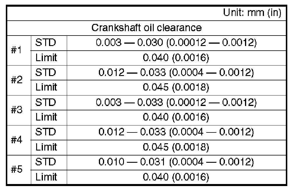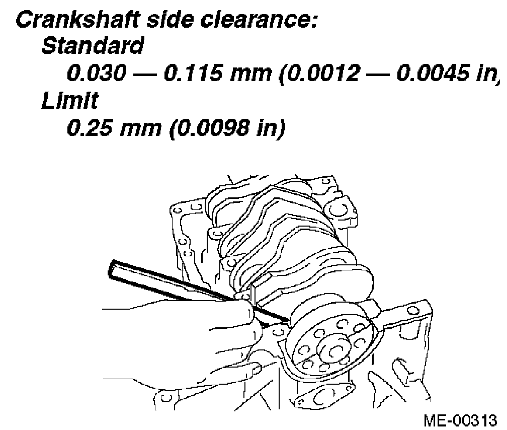 4. Measure the thrust clearance of crankshaft at center bearing. If the clearance exceeds the limit, replace the bearing.