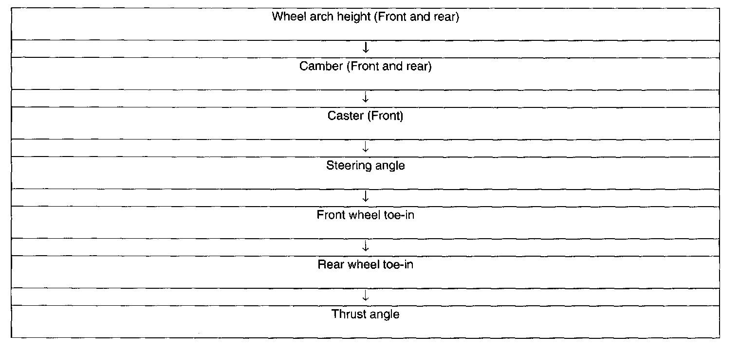 Check, adjust and/or measure the wheel alignment in accordance with procedures indicated in the figure: