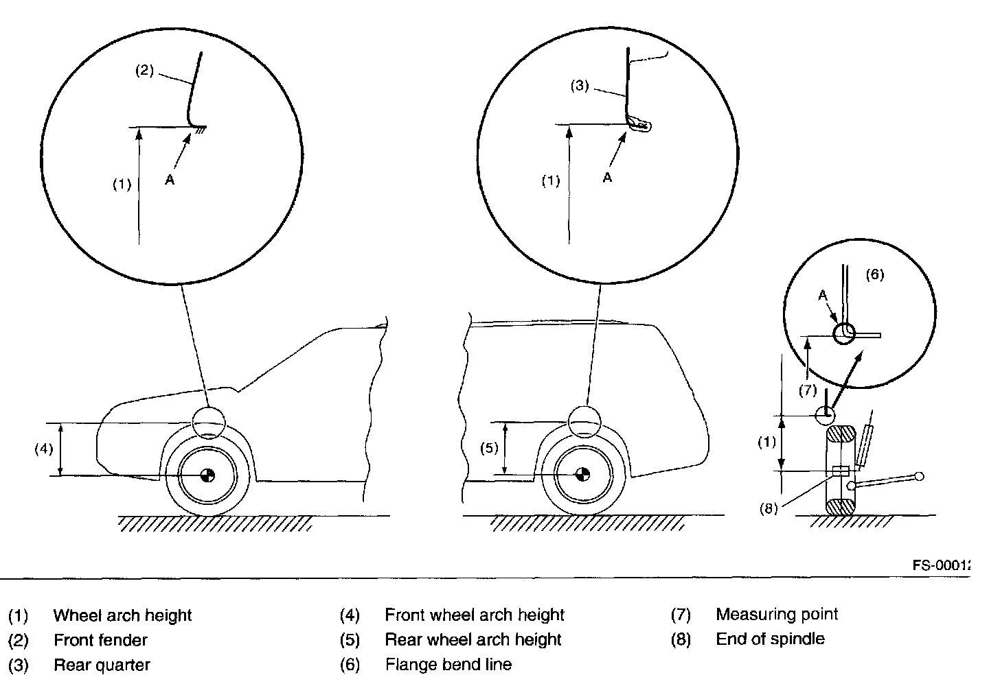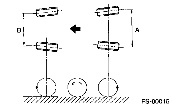 2) Mark each right and left tires at height corresponding to center of spindle and measure the distance "A" between marks.