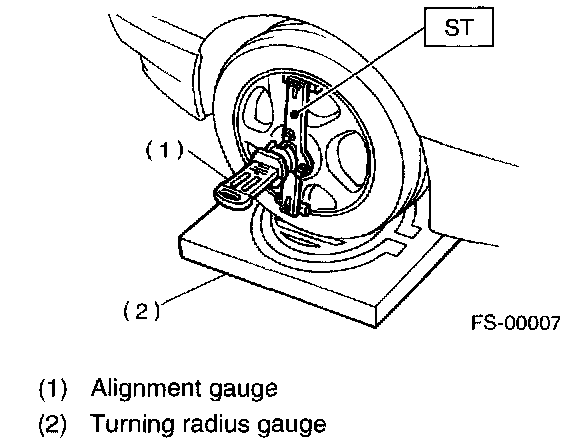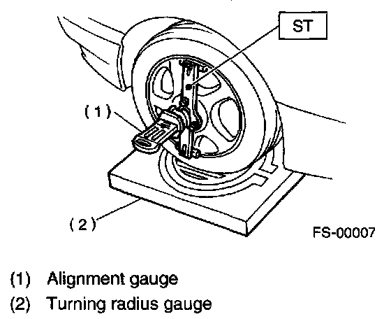 1) Place the front wheel on turning radius gauge. Make sure ground contacting surfaces of front and rear wheels are set at the same height.
