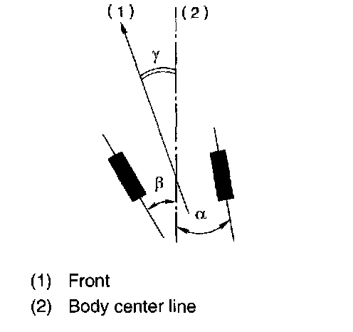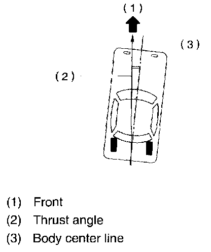NOTE: Thrust angle refers to a mean value of right and left rear wheel toe angles in relation to the vehicle body center line. Vehicle is driven straight in the thrust angle direction while swinging in the oblique direction depending on the degree of the mean thrust angle.