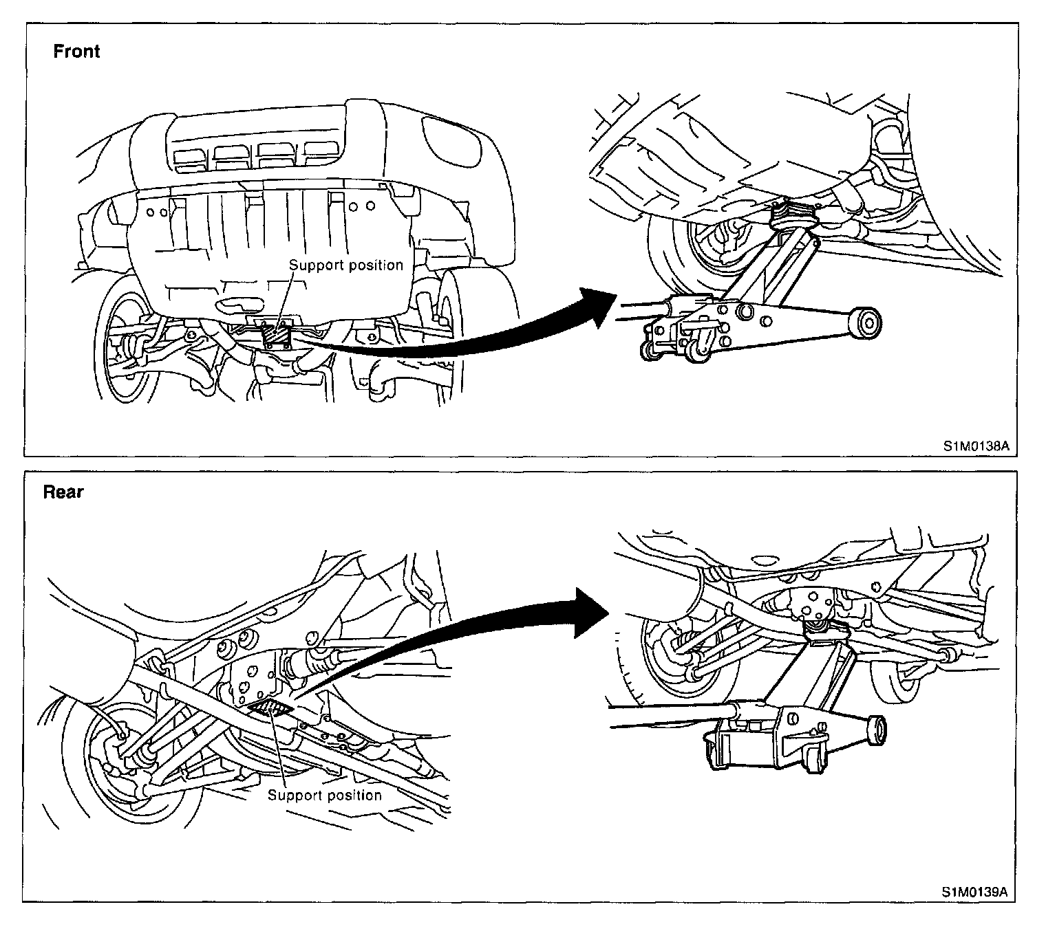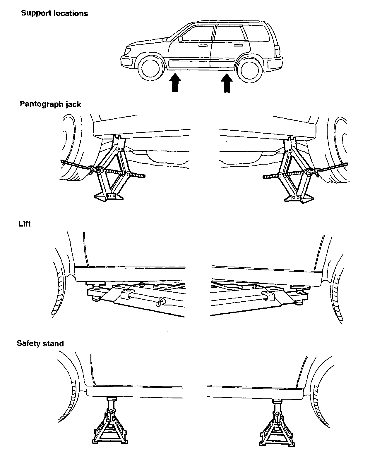 When using a lift or jack-ridged rack to raise a vehicle, always follow instructions concerning jack-up points and weight limits to prevent the vehicle from falling, which could result in injury. Be especially careful to make sure the vehicle is balanced before raising it.