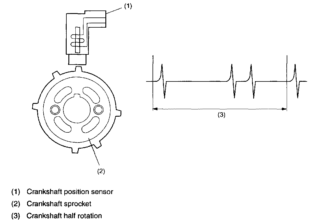 - The crankshaft position sensor is installed on the oil pump which is located in the front center portion of the cylinder block. The sensor generates a pulse when one of the teeth on the perimeter of the crankshaft sprocket (rotating together with the crankshaft) passes in front of it. The ECM determines the crankshaft angular position by counting the number of pulses.