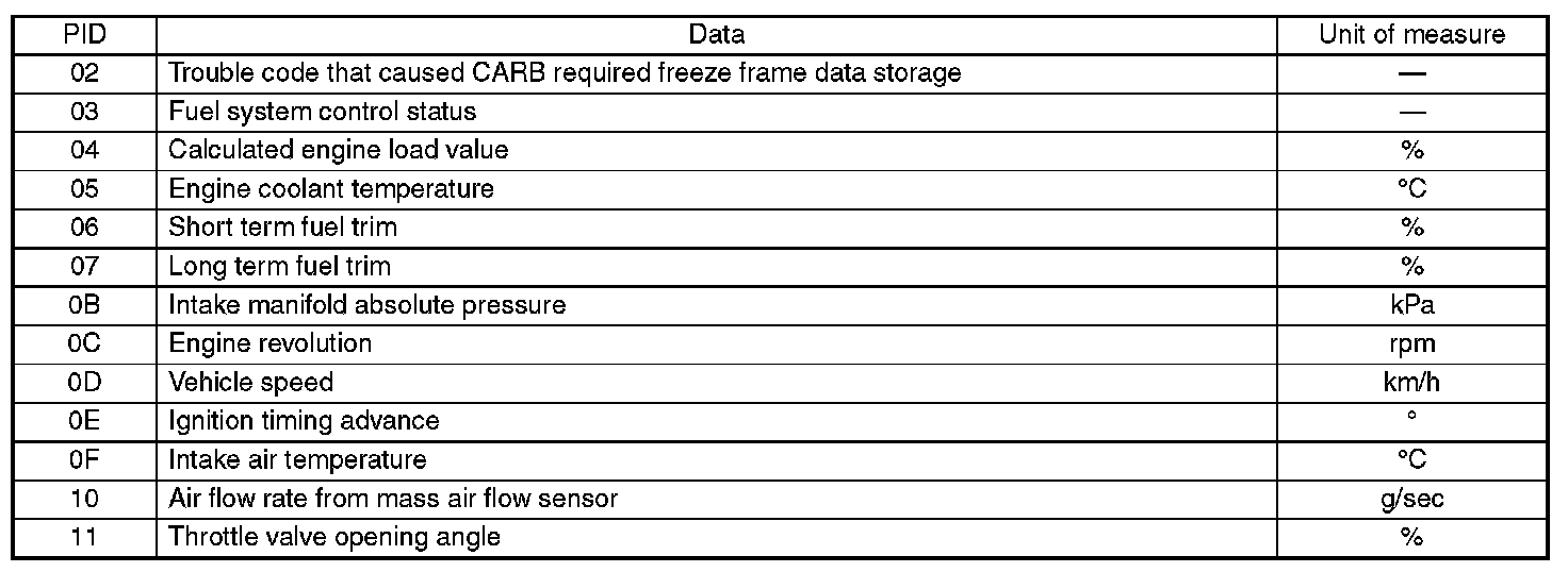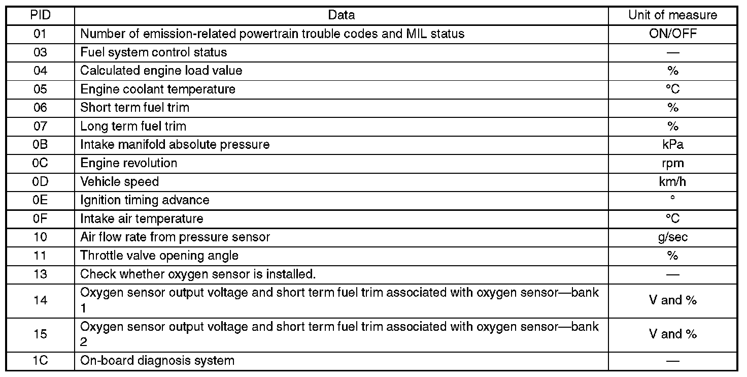A list of the support data and PID (Parameter Identification) codes are shown in the table.
