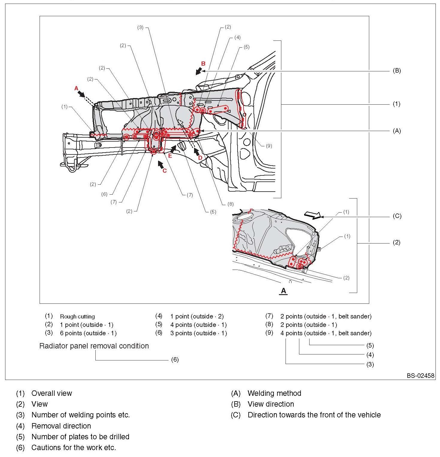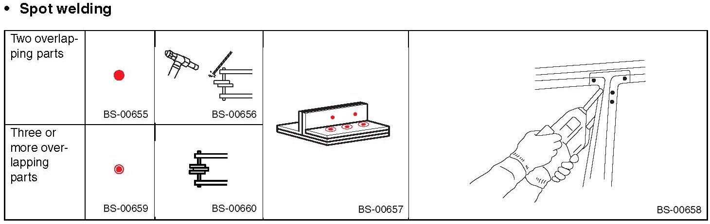 - Symbols and number of points indicate the welding method and the number of welding points. Text in brackets indicates the direction for removal of welded parts, and numbers indicate the number of plates to be drilled in panels of welded parts to be removed.