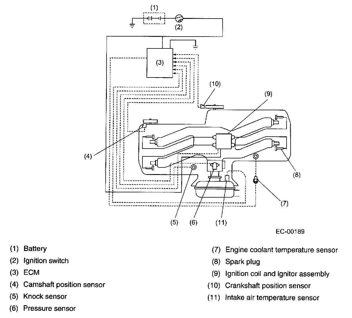 The ECM monitors the operating condition of the engine using the signals from the sensors and switches shown above and determines the ignition timing most appropriate for each engine operating condition. Then it sends a signal to the ignitor, commanding generation of a spark at that timing.