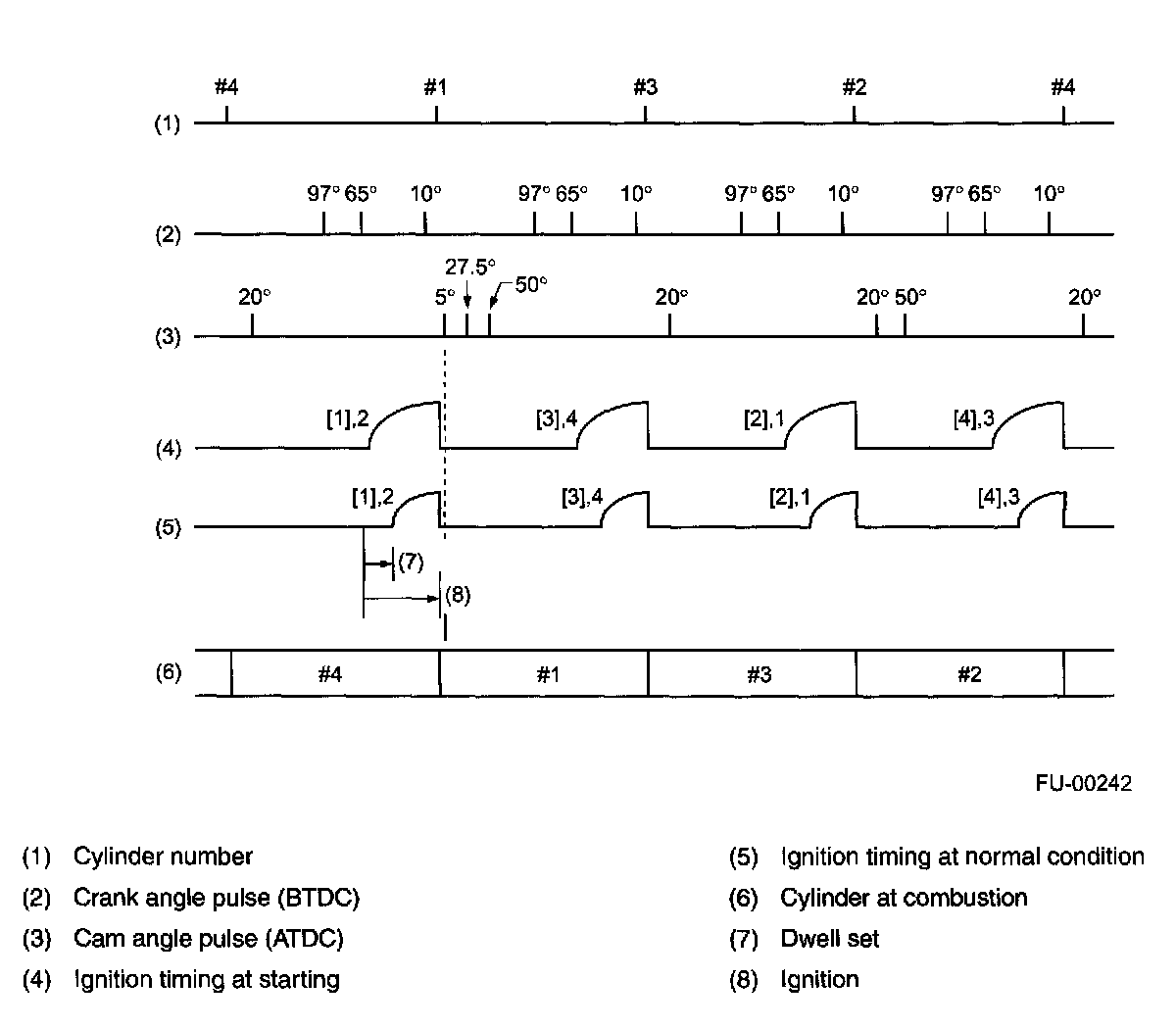 Between the 97 ° and 65 ° crank angle signal, the ECM measures the engine speed, and by using this data it decides the dwell set timing and ignition timing according to the engine condition.