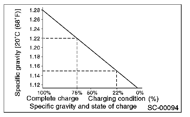 2. Measuring the specific gravity of the electrolyte in battery will disclose the state of charge of battery. The relation between specific gravity and state of charge is as shown in the figure.