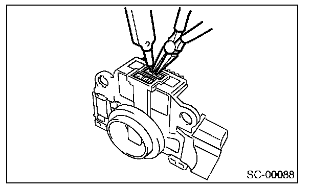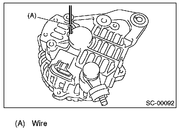 Before assembling, press the brush down into brush holder, and then fix them in that position by passing a [1 mm (0.08 in) dia. 40 to 50 mm (1.6 to 2.0 in) long] wire through the hole as shown in the figure.