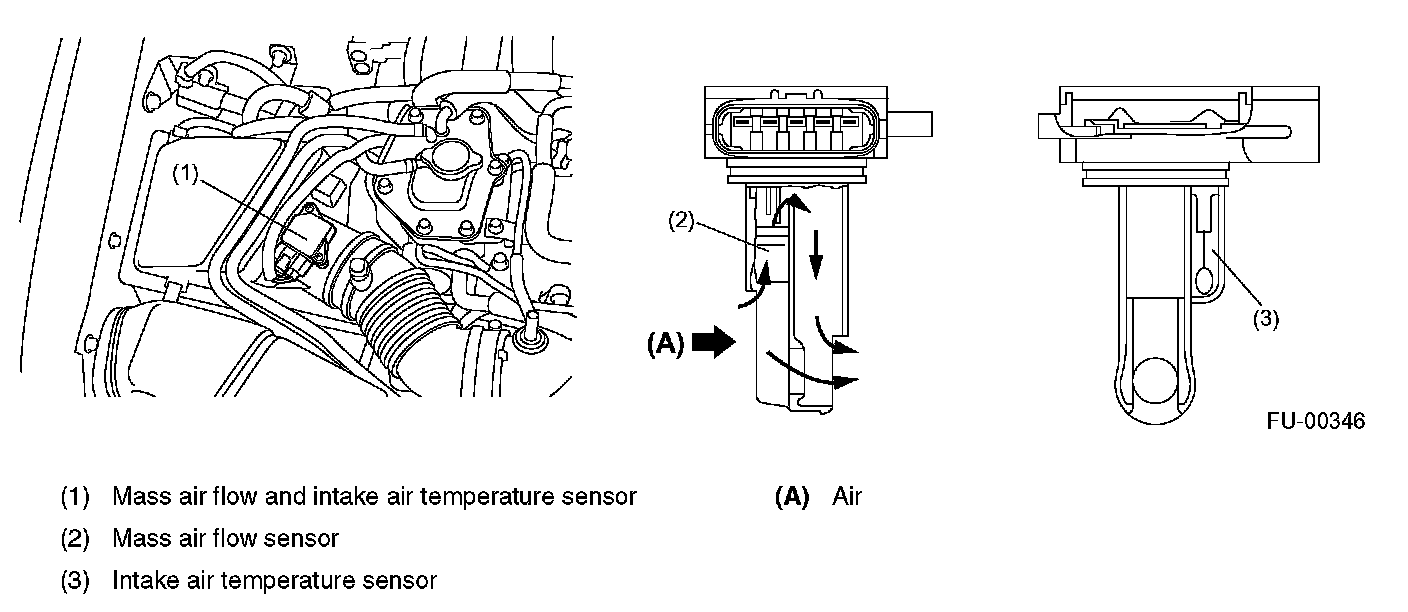 MASS AIR FLOW AND INTAKE AIR TEMPERATURE SENSORThe mass airflow and the intake air temperature sensors are integrated into a single unit. The unit is mounted on the air cleaner case and measures the amount as well as the temperature of the intake air.