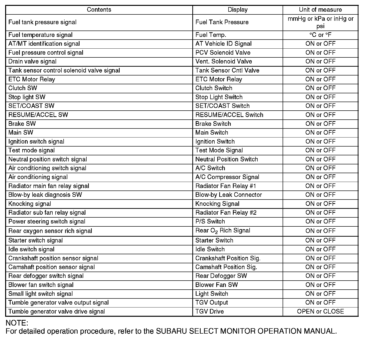 NOTE: For detailed operation procedure, refer to the SUBARU SELECT MONITOR OPERATION MANUAL.