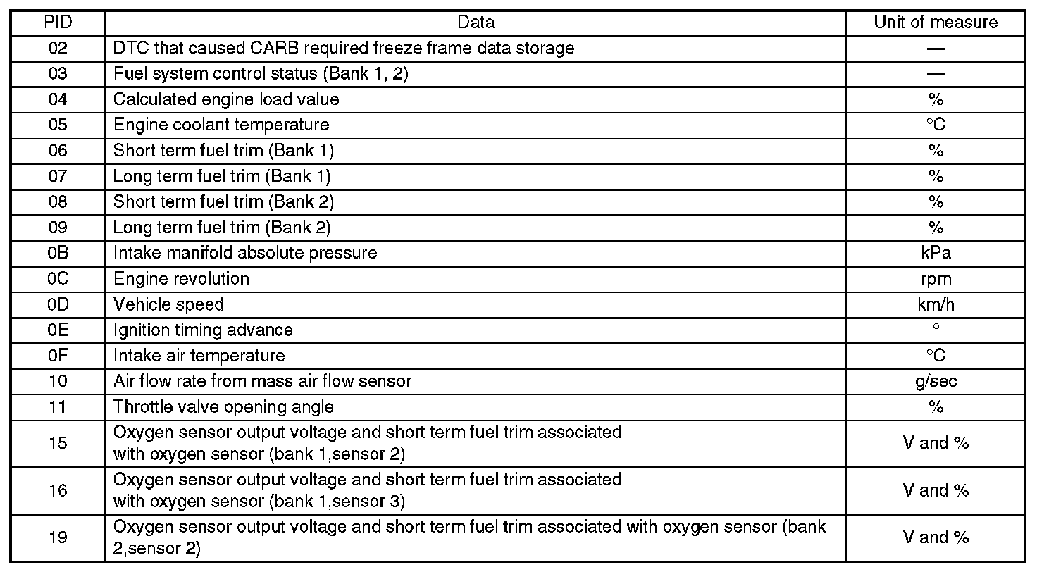 A list of the support data and PID (Parameter Identification) codes are shown in the table.