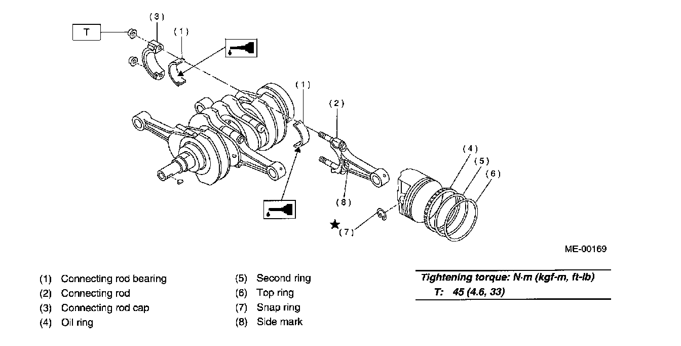 1. If piston ring is broken, damaged, or worn, or if its tension is insufficient, or when the piston is replaced, replace piston ring with a new one of the same size as the piston.