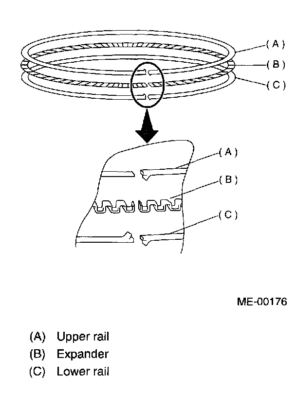 ^ Oil ring consists of upper rail, expander and lower rail. When installing on piston, be careful of each rail's direction.