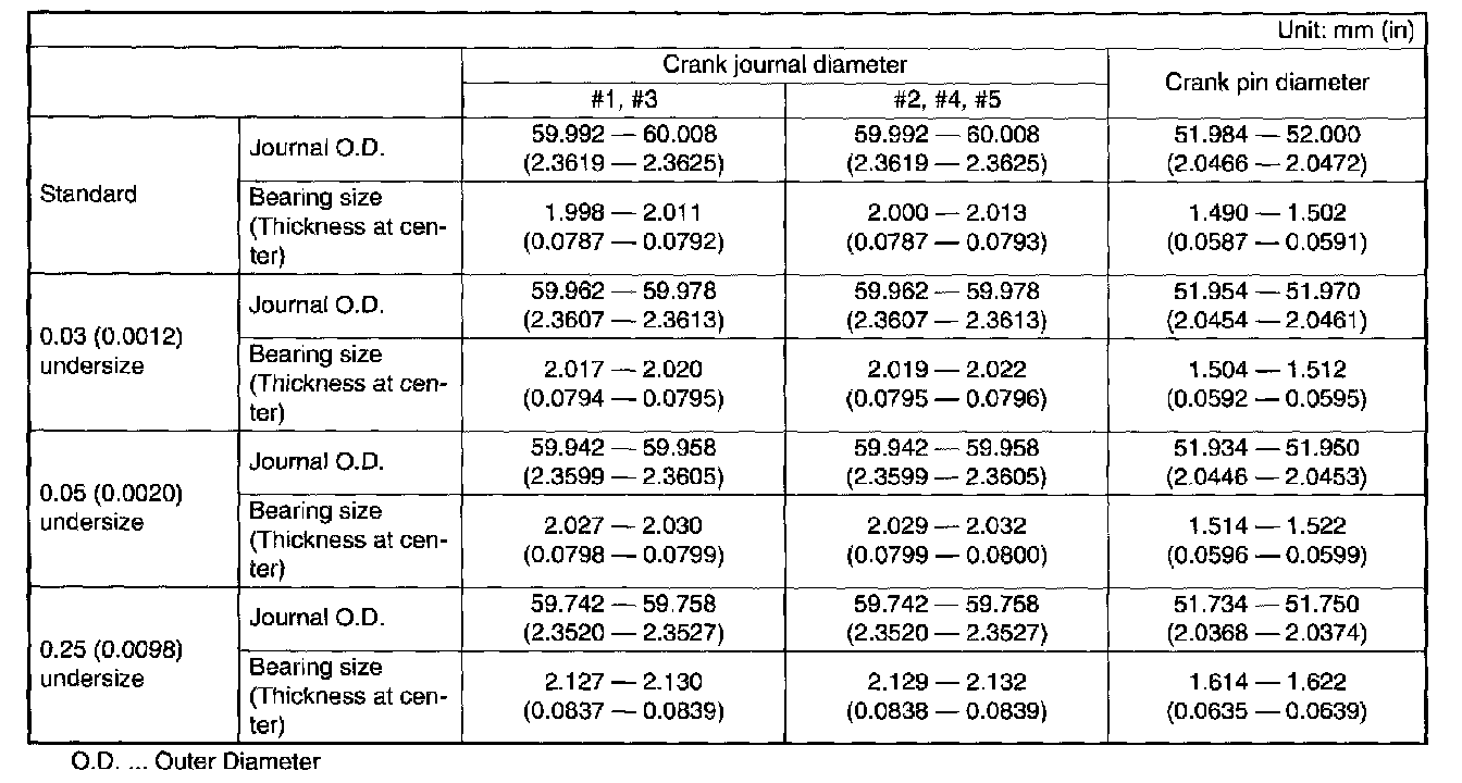 3. Inspect the crank journal and crank pin for wear. If they are not within the specifications, replace bearing with a suitable (undersize) one, and replace or recondition crankshaft as necessary. When grinding crank journal or crank pin, finish them to the specified dimensions according to the undersize bearing to be used.