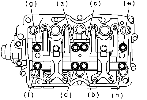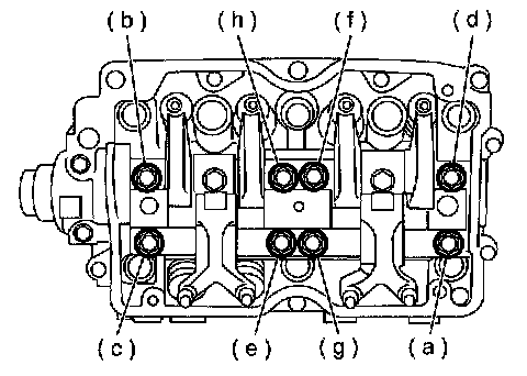 NOTE: Leave two or three threads of bolts (g and h) engaged to retain valve rocker assembly.