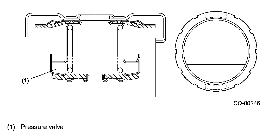 The relief valve cap at the radiator side has a pressure valve. When the radiator inner pressure becomes higher than specified, the pressure valve opens to send coolant to the reservoir tank. This function prevents damage to the radiator components.