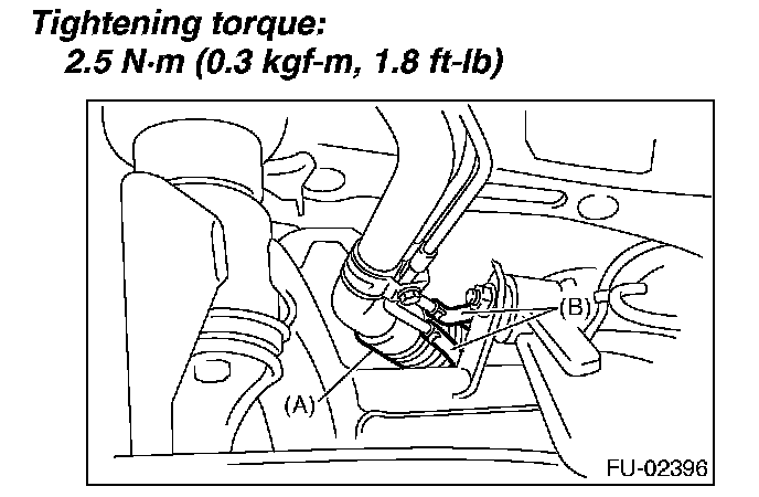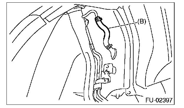 4. Securely insert the fuel filler hose (A) and Evaporation hose (B) to the specified position, then tighten the clamp.