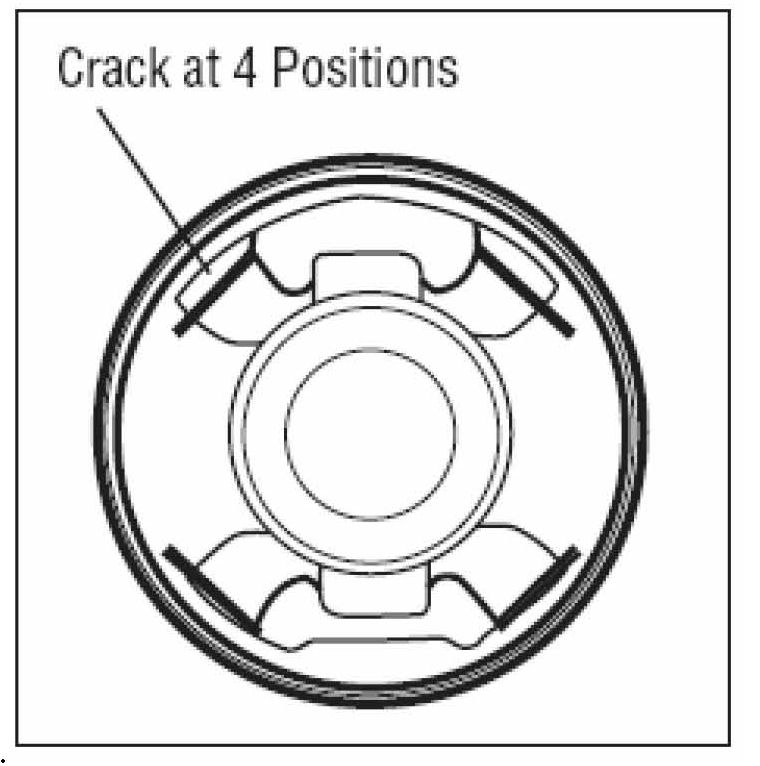 This type of bushing works with compressed rubber and when the control arm travels through its full stroke it stretches a small portion of the bushing and will exhibit a crack or split. This does not affect the performance of the bushing and will not continue to spread to the rest of the bushing. It does not cause body vibrations, noises, or braking issues. A Service Bulletin will be released outlining the above information. See image to the right.
