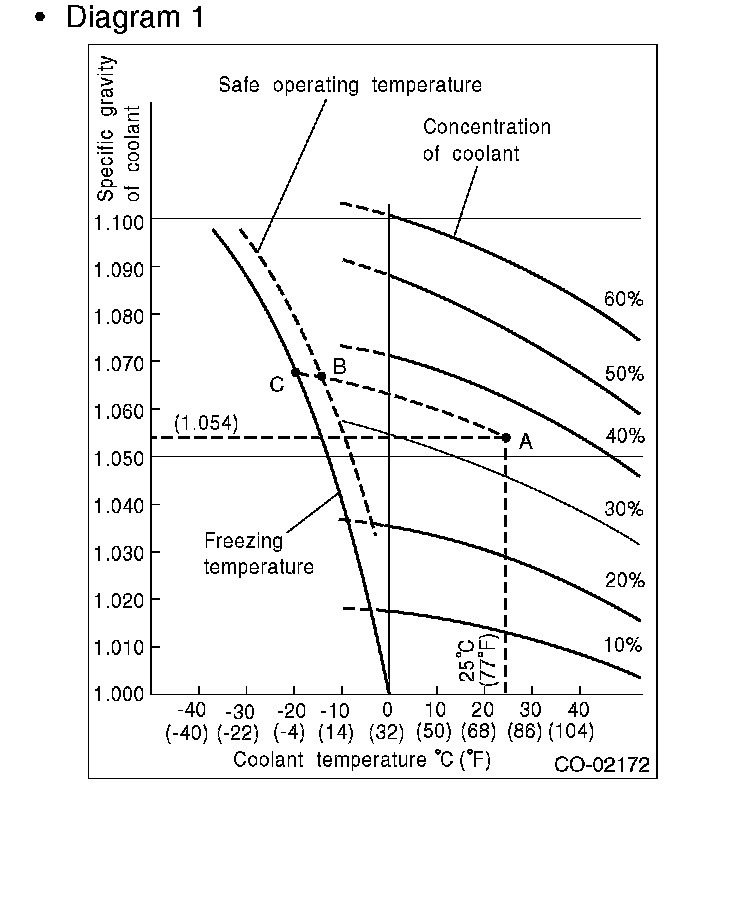 If the coolant temperature is 25°C (77°F) and its specific gravity is 1.054, the concentration is 35% (point A), the safe operating temperature is -14°C (7°F) (point B), and the freezing temperature is -20°C (-4°F) (point C).