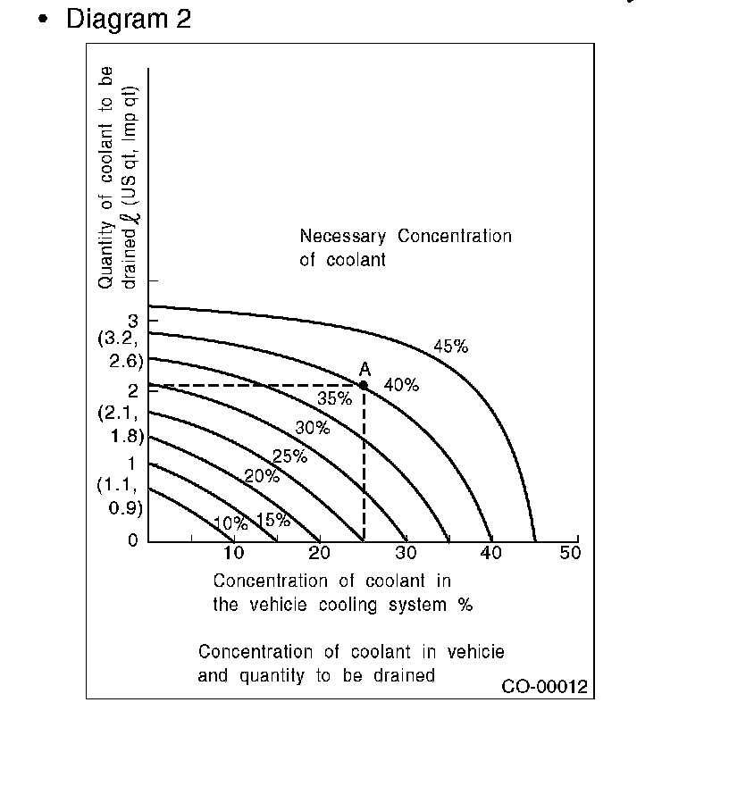 Assume that the engine coolant concentration must be increased from 25% to 40%. Find point A, where the 25% line of engine coolant concentration intersects with the 40% curve of the necessary engine coolant concentration, and read the scale on the vertical axis of the graph at height A. The quantity of coolant to be drained is 2.1 l (2.2 US qt, 1.8 Imp qt). Drain 2.1 l (2.2 US qt, 1.8 Imp qt) of coolant from the cooling system and add 2.1 l (2.2 US qt, 1.8 Imp qt) undiluted engine coolant solution.