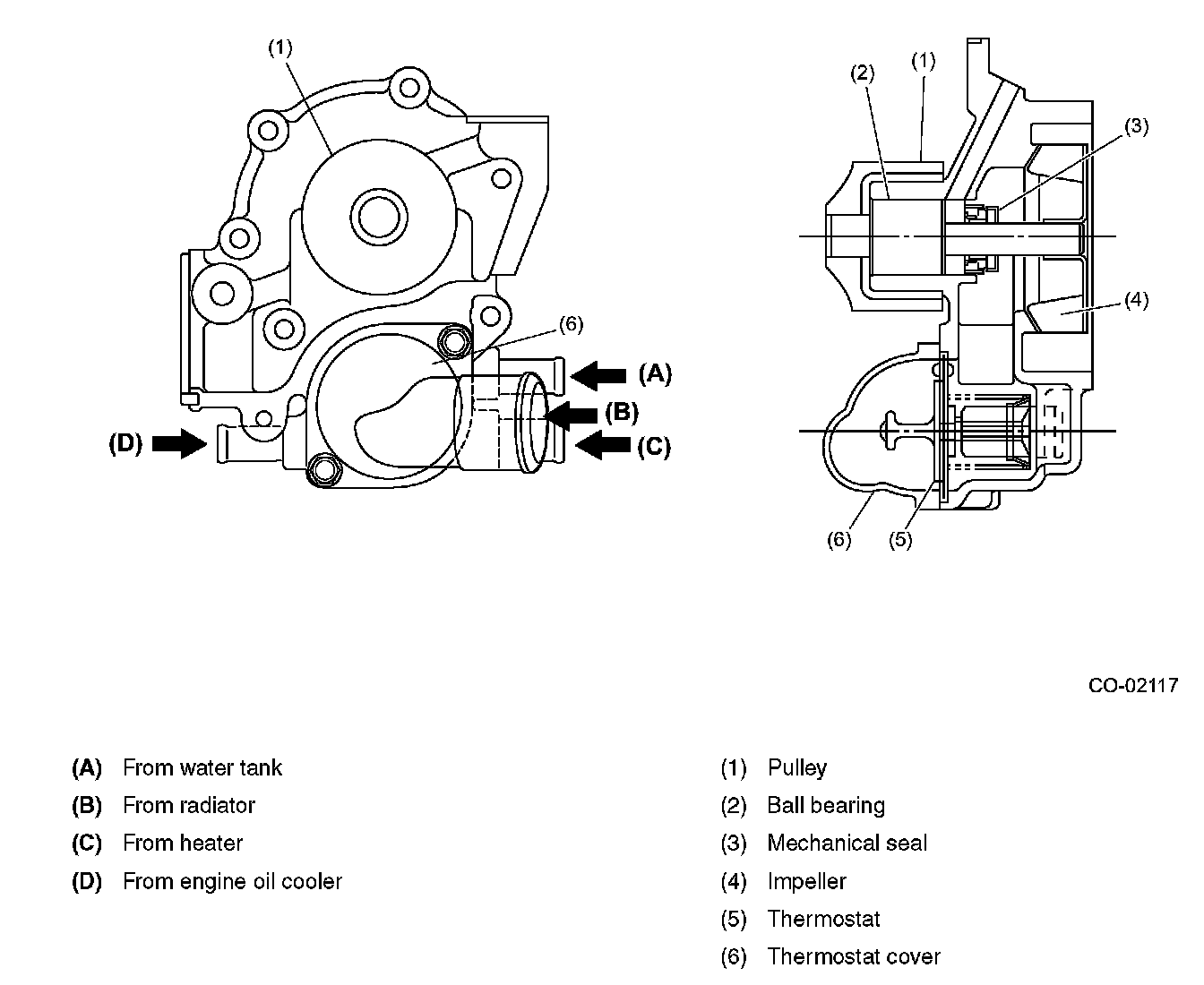 Water PumpThe water pump is located in the front portion of the left bank cylinder block and is driven by the engine through the timing belt. The thermostat is fitted into the coolant inlet at the bottom of the water pump. When the pump's impeller rotates, the coolant is drawn into the pump from the lower pipe (which is connected to the radiator hose) via the thermostat. It then flows along the perimeter of the impeller and then is discharged for circulation through a circuit depending on the coolant temperature.