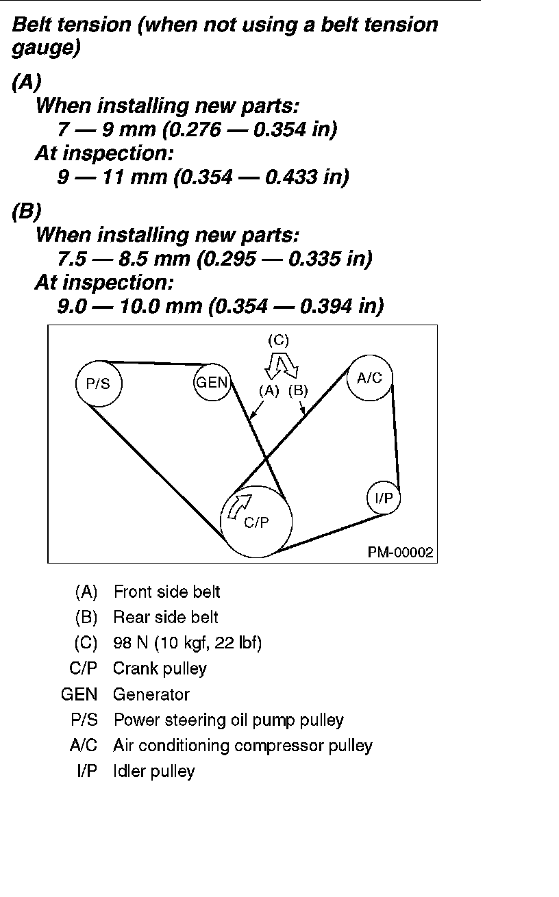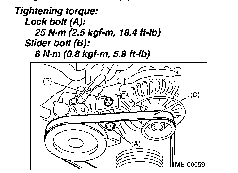 1) Install the front side belt (C), and tighten the slider bolt (B) so as to obtain the specified belt tension.