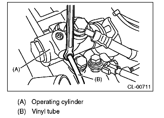 4) Fit one end of a vinyl tube into the air bleeder of the operating cylinder, and put the other end into a clutch fluid container.
