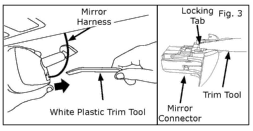 a) Remove 12-pin connector from back of mirror by depressing locking tab with a white plastic trim tool (or equivalent) and remove.